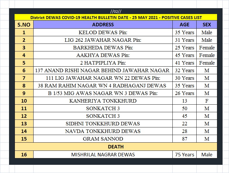 1 पताः-मिश्रीलाल नगर,देवास ,पुरूष उम्र 75 वर्ष ,मृत्यू-जिला अस्पताल देवास