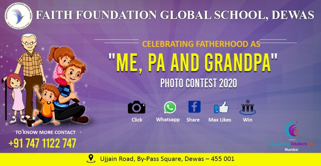 देवास/ फेथ फाउंडेशन ग्लोबल स्कूल द्वारा 21 जून 2020 को फादर्स डे के उपलक्ष्य में मी ,पा एंड ग्रैंड पा प्रतियोगिता का ऑनलाइन आयोजन किया गया है , इस प्रतियोगिता में प्रतिभागी को अपने पापा / दादाजी के साथ एक फोटो क्लिक करके व्हाट्स अप नंबर 7471122747 पर अपनी जानकारी भर कर भेजना होगी । जानकारी प्राप्त होने के पश्चात विद्यालय द्वारा इसे प्रतियोगी क्रमांक के साथ फेथ फाउंडेशन के फेस बुक पेज पर अपलोड किया जायेगा। जिस प्रतियोगी को ज्यादा से ज्यादा लाइक व शेयर उक्त पेज पर मिलेंगे उस प्रतियोगी को विद्यालय द्वारा आकर्षक पुरस्कार दिए जायेंगे। यह जानकारी विद्यालय के प्राचार्य श्री पंकज किटूकले द्वारा दी गई।