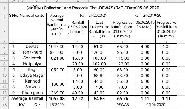 देवास, 05 जून 2020/ जारी मानसून सत्र में दिनांक 05 जून 2020 की स्थिति में जिले के वर्षामापी केन्द्रों पर अब तक औसत रूप से कुल 66.76 मिलीमीटर वर्षा दर्ज की गई है।
