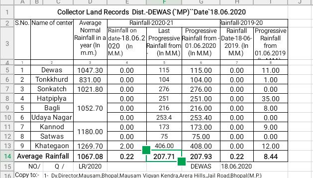 देवास, 18 जून 2020/ जारी मानसून सत्र में दिनांक 18 जून 2020 की स्थिति में जिले के वर्षामापी केन्द्रों पर अब तक औसत रूप से कुल 207.93 मिलीमीटर वर्षा दर्ज की गई है। अधीक्षक भू-अभिलेख से प्राप्त जानकारी के अनुसार जारी मानसून सत्र में अभी तक खातेगांव में 408, सोनकच्छ में 276, उदयनगर में 253.40, हाटपीपल्या में 251, बागली में 216, कन्नौद में 173, देवास में 115, टोंकखुर्द में 104, सतवास में 75 मिमी औसत वर्षा रिकॉर्ड की गई। 24 घंटे में 0.22 मिमी वर्षा दर्ज की गई पिछले 24 घंटों में 0.22 मिमी वर्षा दर्ज की गई। जिसमें खातेगांव में 2 तथा शेष केंद्रों पर शून्य मिमी वर्षा दर्ज की गई थी।पिछले साल 8.44 मिमी औसत वर्षा दर्ज हुई थी अधीक्षक भू-अभिलेख से प्राप्त जानकारी के अनुसार गत मानसून सत्र में अभी तक 8.44 मिमी वर्षा दर्ज की गई थी, जिसमें देवास में 11, टोंकखुर्द में 01, हाटपीपल्या में 35, बागली में 8, कन्नौद में 9, खातेगांव में 12 तथा शेष केंद्रों पर शून्य मिमी वर्षा दर्ज की गई थी।