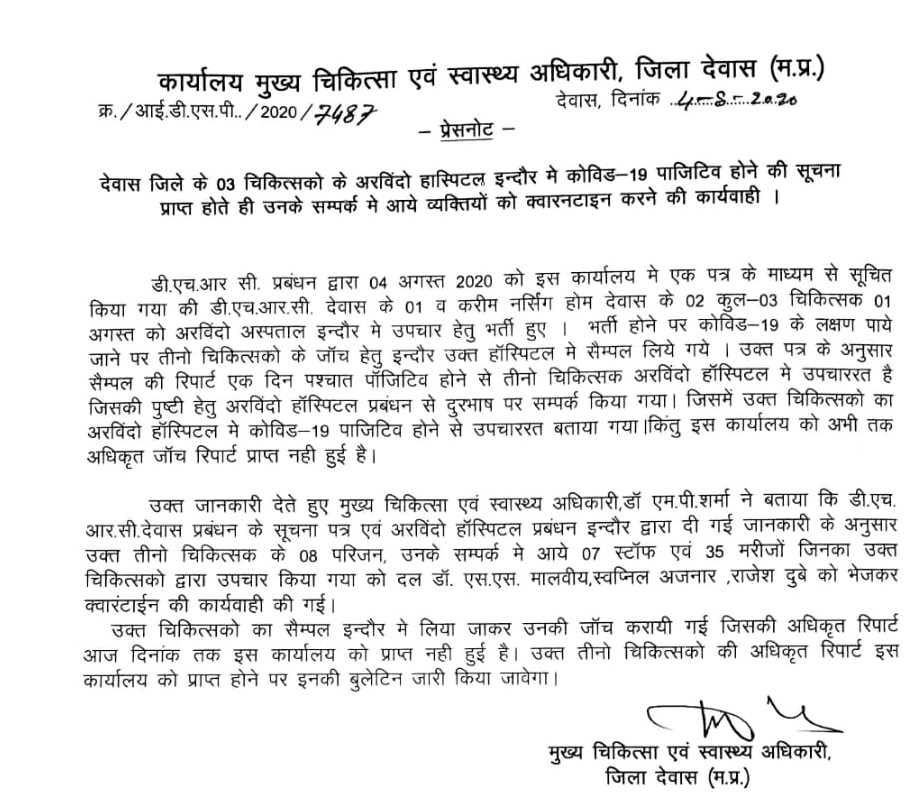देवास/ डी.एच.आर सी. प्रबंधन द्वारा 04 अगस्त 2020 को इस कार्यालय मे एक पत्र के माध्यम से सूचित किया गया की डी.एच.आर.सी. देवास के 01 व करीम नर्सिंग होम देवास के 02 कुल-03 चिकित्सक 01 अगस्त को अरविंदो अस्पताल इन्दौर मे उपचार हेतु भर्ती हुए । भर्ती होने पर कोविड-19 के लक्षण पाये जाने पर तीनो चिकित्सको के जाॅच हेतु इन्दौर उक्त हाॅस्पिटल मे सैम्पल लिये गये। उक्त पत्र के अनुसार सैम्पल की रिपार्ट एक दिन पश्चात पाॅजिटिव होने से तीनो चिकित्सक अरविंदो हाॅस्पिटल मे उपचाररत है जिसकी पुष्टी हेतु अरविंदो हाॅस्पिटल प्रबंधन से दुरभाष पर सम्पर्क किया गया। जिसमें उक्त चिकित्सको का अरविंदो हाॅस्पिटल मे कोविड-19 पाजिटिव होने से उपचाररत बताया गया। किन्तु इस कार्यालय को अभी तक अधिकृत जाॅच रिपार्ट प्राप्त नही हुई है।