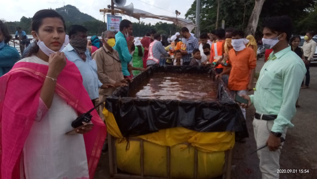 देवास/श्री गणेश चतुर्थी पर घर-घर विराजे श्री गणेजी की प्रतिमाओ का विसर्जन नगर निगम की टीम द्वारा शहर के सम्पूर्ण 45 वार्डो मे 15 वाहनो से एवं मीठा तालाब से श्री गणेशजी की प्रतिमाओ को प्राप्त कर कालुखेडी तालाब पर सम्मानपूर्वक विसर्जन किया गया। नगर निगम आयुक्त विशालसिह चौहान के निर्देशन मे तैनात निगम अधिकारियो, कर्मचारियो द्वारा शहर के वार्डो से निगम के वाहन मे घर-घर से श्री गणेशजी की प्रतिमाओ को श्रद्धालुओ से प्राप्त किया गया। जिसमे मीठा तालाब पर आने वाले श्रद्धालुओ से गणेशजी की प्रतिमाओ को प्राप्त कर तालाब पर प्रतिकात्मक रूप से बनाये गये कुण्ड मे मीठा तालाब का जल भरा गया। जिसमे प्रतिमाओ को विधी विधान पूर्वक स्नान कराकर उन प्रतिमाओ को निगम के वाहन से कालुखेडी स्थित तालाब मे सम्मानपूर्वक विसर्जित किया गया।