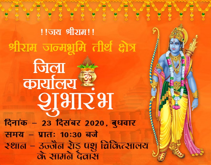 देवास। अयोध्या में श्रीराम की भव्य मंदिर सरकारी पैसे से नहीं रामभक्तों के सहयोग से बनेगा। इसके लिए देशव्यापी जनसंपर्क और योगदान अभियान के लिए श्रीराम जन्मभूमि तीर्थ क्षेत्र बनाया गया है।  जिसका पूरे देश में व्यापक रूप से विस्तार हो रहा है और लोग इसमें बढ़-चढ़कर हिस्सा ले रहे है। इसी के तहत श्रीराम जन्मभूमि तीर्थ क्षेत्र के जिला कार्यालय का शुभारंभ नारायण कुटी सन्यास आश्रम के संत सुरेशानंद तीर्थ, विहिप प्रांतमंत्री सोहन विश्वकर्मा, राष्ट्रीय स्वयंसेवक संघ विभाग संघचालक कैलाश चंद्रावत सहित प्रबुद्धजनों के करकमलों द्वारा 23 दिसंबर, बुधवार को प्रात: 10 बजे उज्जैन रोड़ स्थित पशु चिकित्सालय के सामने होगा। उक्त जानकारी जिला प्रचार प्रमुख अर्जुन वर्मा ने दी।