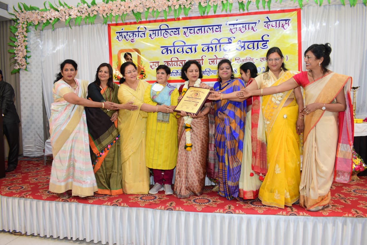 देवास। शहर की प्रख्यात शिक्षाविद समाजसेवी स्व, कविता शर्मा जोशी की स्मृति में संस्कृति साहित्य रचनालय संसार  द्वारा अवार्ड प्रसिद्ध महिलाओ को प्रदान किए गए। विश्व महिला दिवस पर निजी होटल में लायनेस क्लब एवं मारवाड़ी महिला मंडल देवास तथा भारत विकास परिषद का संयुक्त कार्यक्रम कविता बहन को महिलाओ ने याद किया। सर्वप्रथम स्वागत भाषण अभिज्ञान जोशी , राजश्री सोनी,  सोफिया कुरैशी , विनीता दुबे, सीमा शर्मा आदि ने दिया। समारोह की मुख्य अतिथि  पूर्व महापौर रेखा वर्मा,  राष्ट्रीय उपाध्यक्ष सुमन मूंदड़ा थी।