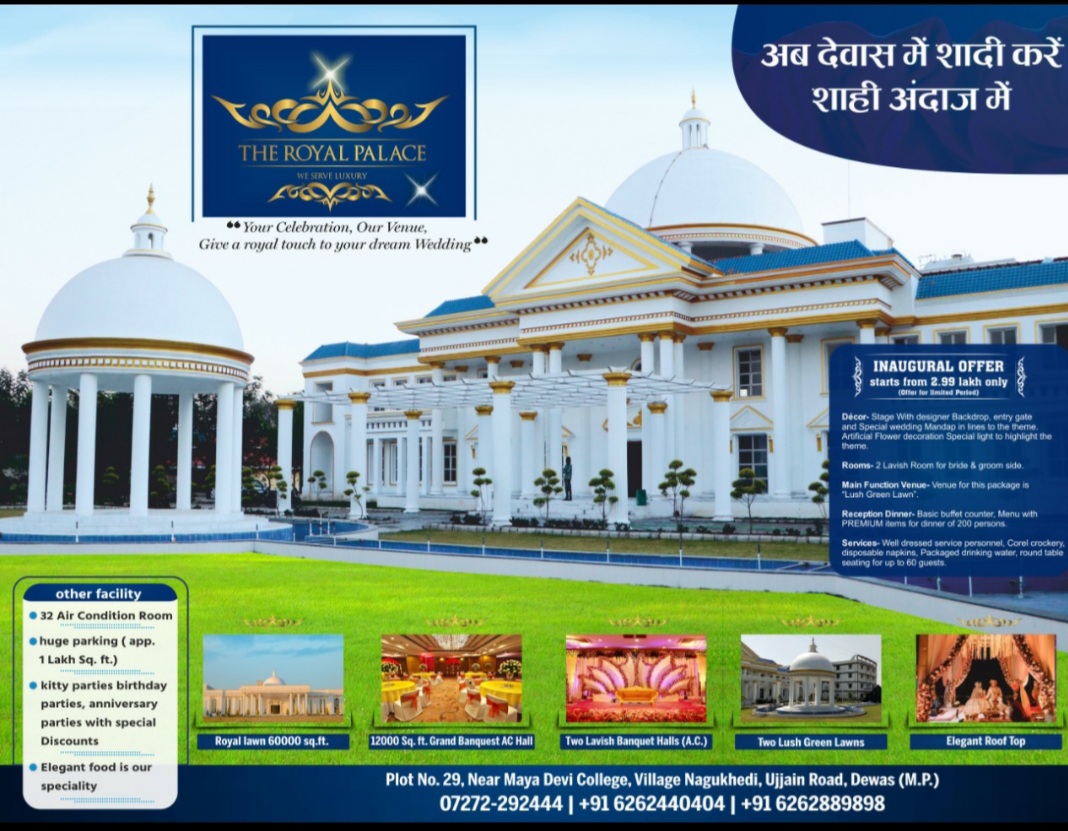 देवास। देवास कि चारों दिशाओं में वर्तमान स्थिति में विकास कार्य के साथ-साथ देवास को नई सौगातें मिलती आ रही है। इसी सौगात की कड़ी में उज्जैन रोड पर द रॉयल पैलेस की शुरूवात हुई है। द रॉयल पैलेस पर शाही अंदाज में शादी समारोह का आयोजन किया जा सकता है। जहाँ आप अपने परिवार के विवाह समारोह को एक शाही अंदाज दे सकते है। जो आपके बजट में सम्भव है।