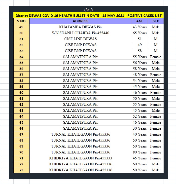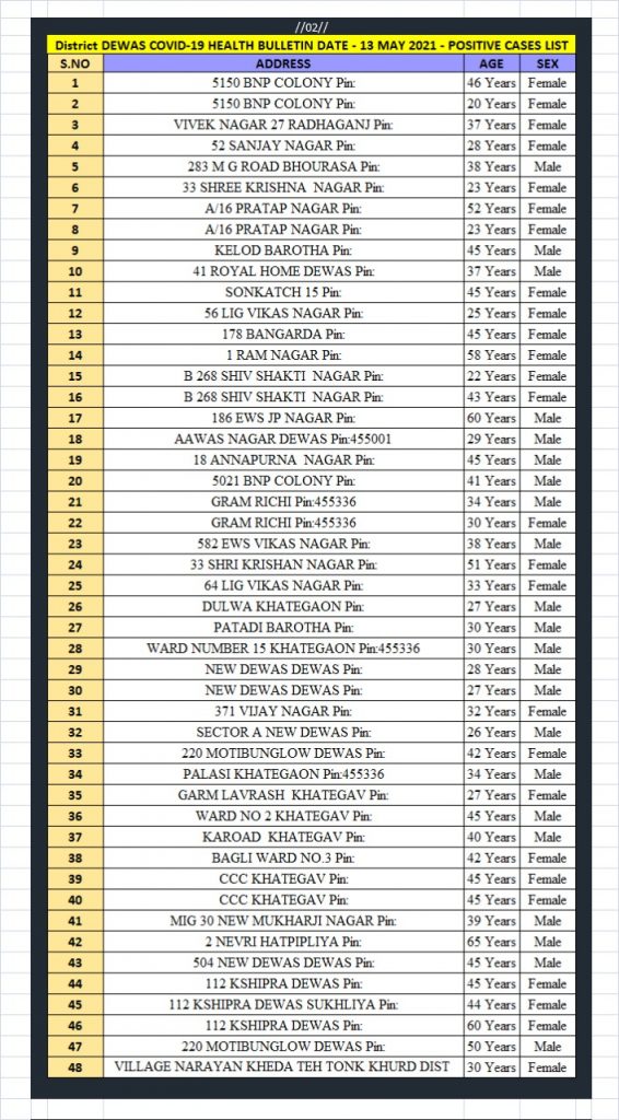 ◆ आज प्राप्त रिपोर्ट मे कोरोना संक्रमित (पाजिटिव) केसेस जानकारीः-संलग्न सूची-02,03,