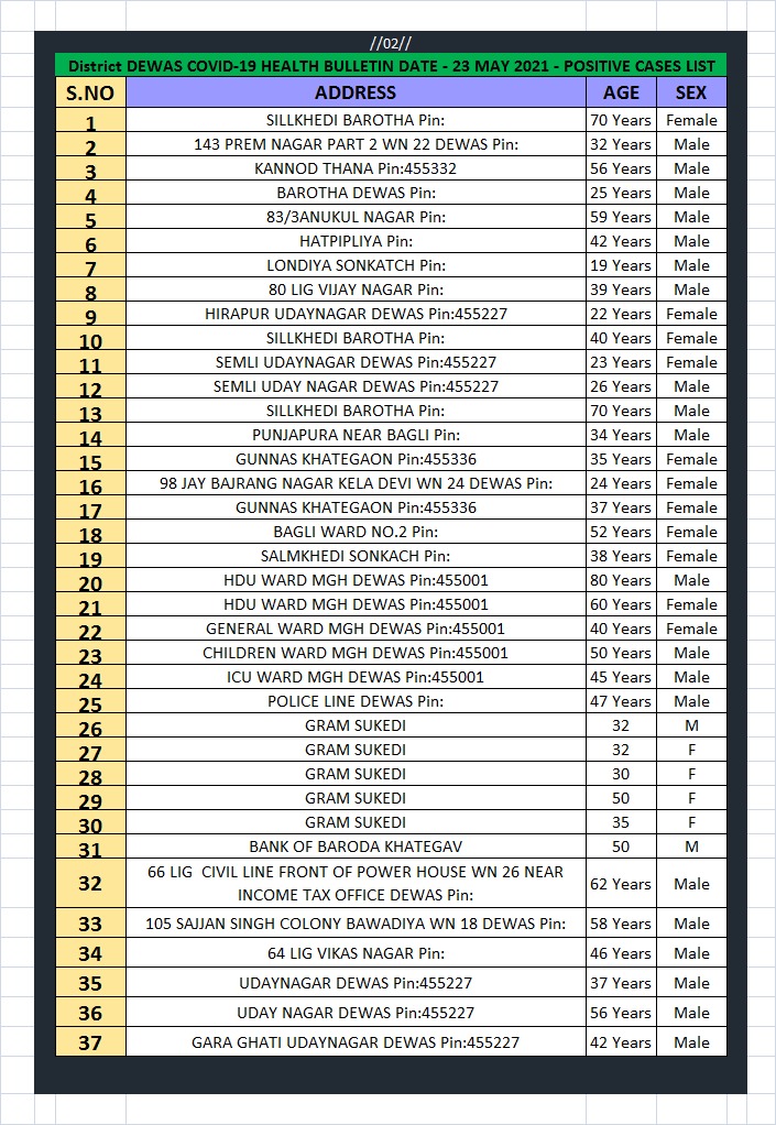 ◆ आज प्राप्त रिपोर्ट मे कोरोना संक्रमित (पाजिटिव) केसेस जानकारीः-संलग्न सूची-