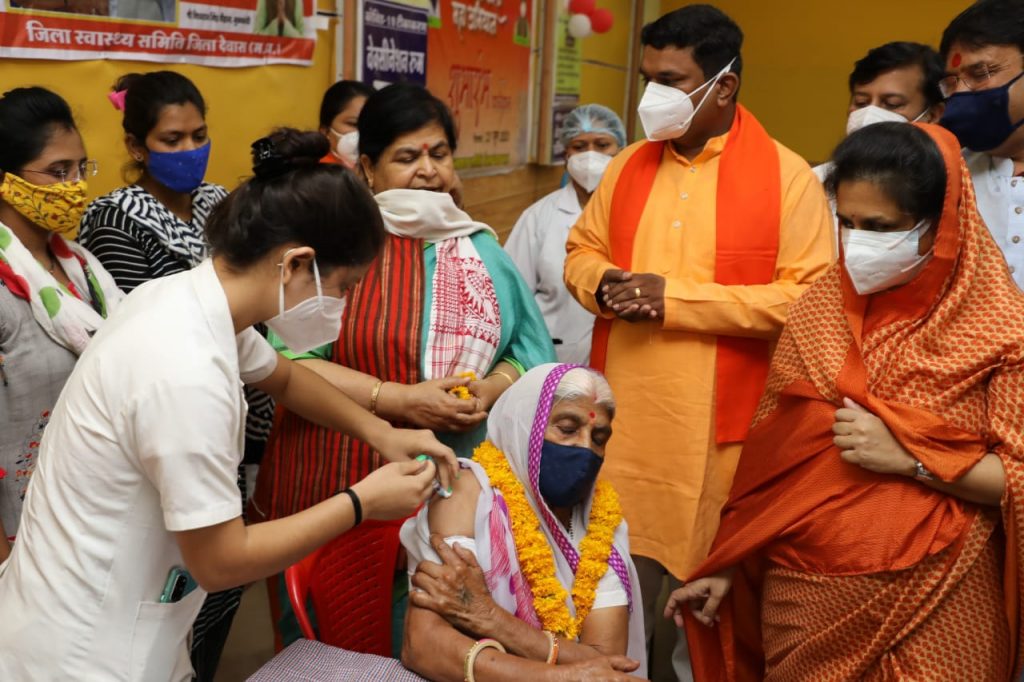 देवास 21 जून 2021/ 21 जून-अंतर्राष्ट्रीय योग दिवस पर पूरे प्रदेश के साथ ही जिले में भी कोरोना वैक्सीनेशन का महा-अभियान प्रारंभ हुआ। देवास जिले में प्रेदेश की पर्यटन, संस्कृति एवं अध्यात्म विभाग मंत्री तथा जिले की प्रभारी मंत्री सुश्री उषा ठाकुर ने मल्हार स्मृति मंदिर देवास में वैक्सीनेशन महा-अभियान का शुभारंभ किया। अभियान के शुभारम्भ पर मल्हार स्मृति मंदिर देवास में प्रभारी मंत्री सुश्री उषा ठाकुर की उपस्थिती में 78 वर्ष की बुजुर्ग कमला बाई को वैक्सीन का दूसरा डोज लगाया। इस दौरान सांसद महेंद्रसिंह सोलंकी, विधायक श्रीमती गायत्रीराजे पवार, राजीव खंडेलवाल, पूर्व महापौर सुभाष शर्मा, कलेक्टर चंद्रमौली शुक्ला, नगर निगम आयुक्त विशाल सिंह चौहान, एसडीएम प्रदीप सोनी, सीएमएचओ डॉ. एम. पी. शर्मा, रवि जैन, दुर्गेश अग्रवाल सहित अन्य जनप्रतिनिधिगण एवं अधिकारीगण उपस्थित थे।