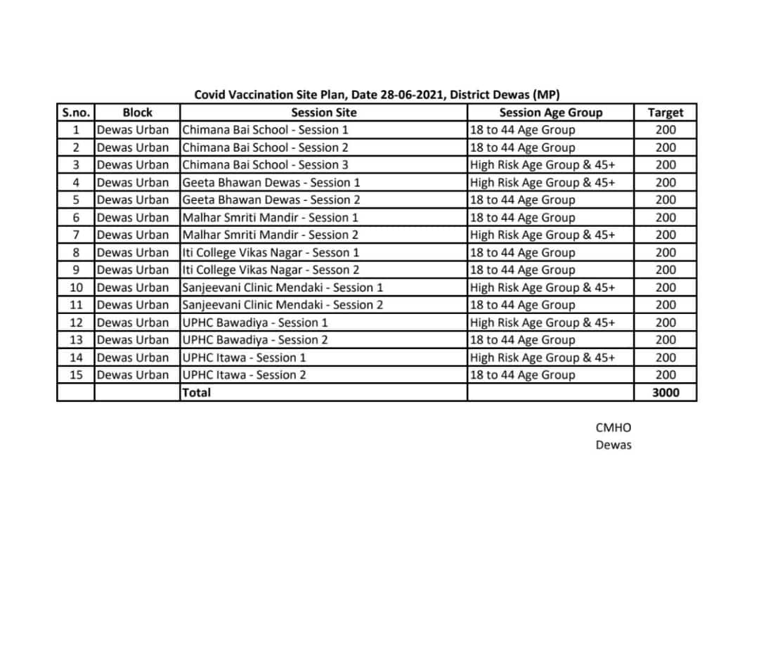 मुख्य चिकित्सा एवं स्वास्थ्य अधिकारी डॉ. एम.पी.शर्मा ने बताया कि कलेक्टर चंद्रमौली शुक्ला के निर्देशन मे देवास जिले में टीकाकरण किया जा रहा है। जिले में कोरोना से सुरक्षा हेतु अब तक 4 लाख 48 हजार 899 टीके ,लगाये गये। जिले में दिनांक 28.06.2021 को कॉविड -19 टीकाकरण सत्र चिमनाबाई स्कूल, गीता भवन देवास ,मल्हार स्मृति मंदिर देवास,आईटीआई कॉलेज विकास नगर , संजीवनी क्लिनिक मेंडकी, यूपीएचसी बावड़िया ,यूपीएचसी इटावा देवास में आयोजित होगा सत्र में को-वैक्सीन के दोनों डोज़ लगाये जाएगे। जिले में कोविड 19 टीकाकरण आयोजित होने वाले सत्र ऑनसाइट रजिस्ट्रेशन के माध्यम से किए जाएंगे पात्र हितग्राहियों का टीकाकरण किया जाएगा।
