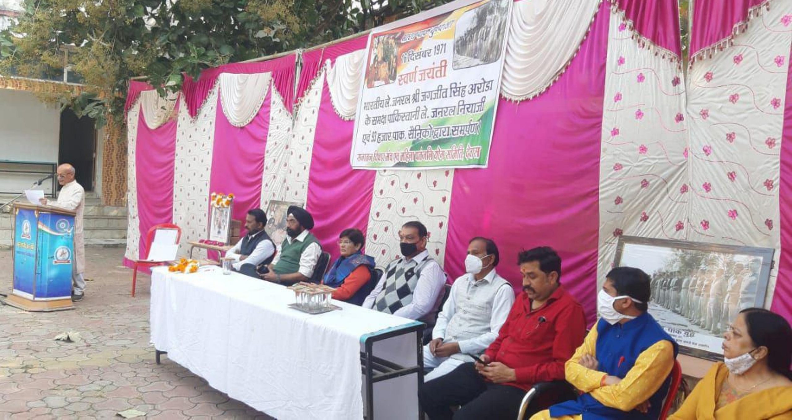 देवास। 1971 के भारत  पाकिस्तान युद्ध में 16 दिसंबर 1971 को पाकिस्तान ने भारत के सामने घुटने टेक कर समर्पण किया था, जो कि विश्व के इतिहास का शत्रु सेना द्वारा किया गया सबसे बड़ा समर्पण था। इस विजय दिवस की 50 वीं वर्षगांठ को स्वर्ण जयंती के रूप में पूरे देश के साथ देवास में सनातन विचार मंच एवं महिला पतंजलि योग समिति द्वारा सरस्वती ज्ञान पीठ विद्यालय में मनाया गया। इस आयोजन में प्रमुख रूप से महेंद्र कुमार नागर, इंद्रपाल सिंह मलिक, अंसारी, सनातन विचार मंच के संस्थापक रविंद्र नाथ भारद्वाज, अध्यक्ष डा. केके धुत, उपाध्यक्ष अमरजीत सिंह खनूजा, विश्व स्तर के साहित्यकार कला गुरु राजकुमार चंदन, प्रेस क्लब अध्यक्ष अतुल बागलीकर, पूर्व महापौर रेखा वर्मा, पूर्व पार्षद मनीष सेन, पतंजलि के प्रदेश अधिकारी अनंत जोशी, सिख समाज के अध्यक्ष दीप सिंह जुनेजा, महिला पतंजलि योग समिति की  जिलाध्यक्ष श्रीमती कमलेश भारद्वाज, मोहन लाल शर्मा एवं पूर्व पूर्व सैनिकों सहित शहर के प्रबुद्ध नागरिक गण एवं विद्यालय के छात्र-छात्राएं उपस्थित थे। कार्यक्रम की शुभारंभ 1971 में शहादत हुए वीर सैनिकों का स्मरण  करते हुए नवीन नाहर ने कार्यक्रम की भूमिका पर प्रकाश डालते हुए, अतिथियों के प्रति शब्द सुमन से स्वागत किया।