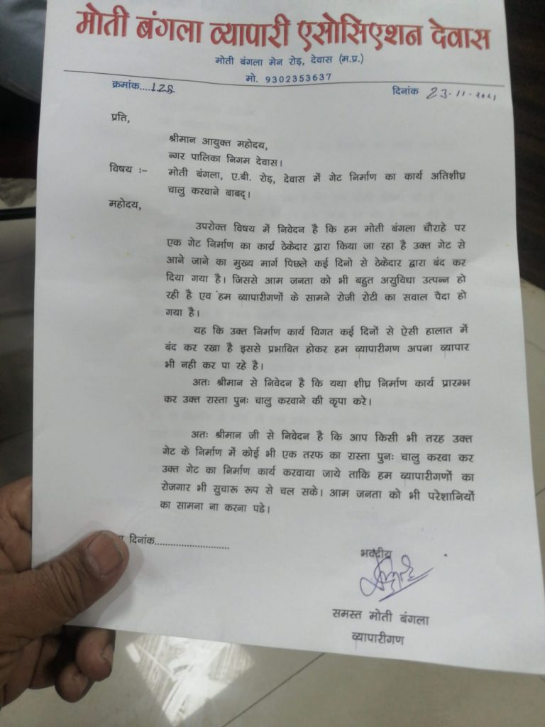 ऐसे में यहां गेट के निर्माणकार्य के कारण मेंन रोड़ बंद कर रखा है। जिस कारण व्यापारी, रहवासी एवं आम जनता को परेशानी का सामना करना पड़ रहा है। जिसे लेकर मोती बंगला के व्यापरियों ने नगर निगम आयुक्त विशाल सिंह चौहान से 23 नवंबर 2021 को भी मांग कि थी। सभी चाहते है की गेट के निर्माण को जल्द खत्म कर मोती बंगला के व्यस्तम मार्ग को आमजन हेतु खोला जाए।
