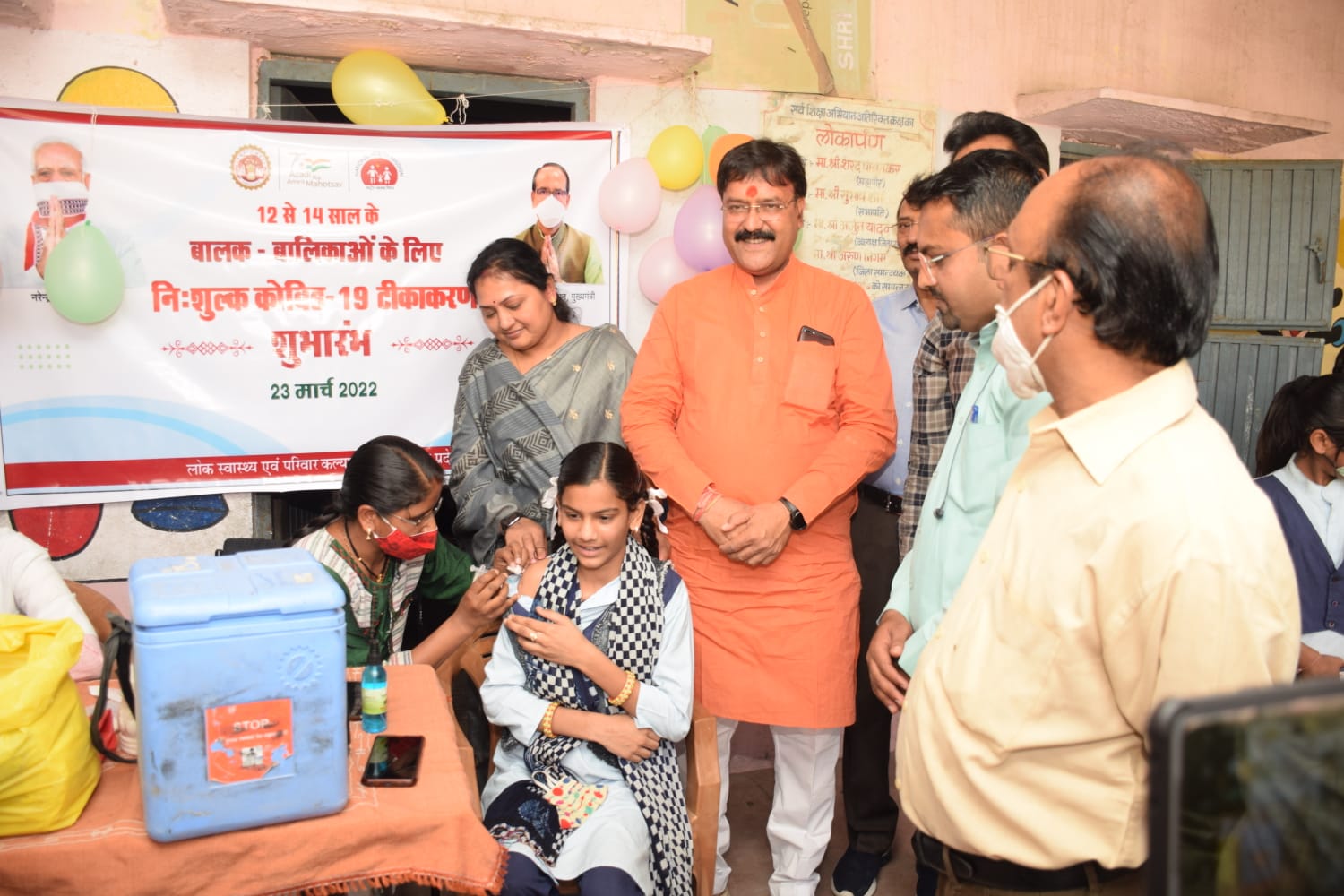 देवास 23 मार्च 2022/ जिले में कलेक्‍टर चन्‍द्रमौली शुक्‍ला के मार्गदर्शन वैक्‍सीनेशन कार्य किया जा रहा है। जिले में 12 से 14 वर्ष आयुवर्ग बालक/बालिकाओं का कोविड-19 वैक्सीनेशन अभियान आज 23 मार्च से प्रारम्‍भ हो गया है। जिले में पात्र 12 से 14 वर्ष आयुवर्ग बालक/बालिकाओं को वैक्सीन लगायी गई। अभियान का शुभारम्‍भ महारानी चिमनाबाई शासकीय कन्या मा.वि देवास में राजीव खंडेलवाल एवं क्षेत्रीय पार्षद श्रीमती पुर्णिमा खंडेलवाल ने किया। स्कूल की बालिका सना मिर्जा पिता आरिफ मिर्जा उम्र 13 वर्ष ने उत्साह पूर्वक पहला टीका लगवाया। इस अवसर पर मुख्य चिकित्सा एवं स्वास्थ्य अधिकारी डॉ. एमपी शर्मा, जिला टीकाकरण अधिकारी डॉ सुनील तिवारी, शहरी नोडल अधिकारी डॉ अजहर शैख, बीईई सुखदेव रावत, शाला के प्राचार्य दीपक शुक्ला सहित शिक्षक एवं शिक्षिका उपस्थिति रही। शाला परिसर को रंगोली एवं गुब्बारों से सजाया गया।