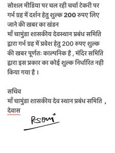 दिन भर की चली सोशल मिडिया की चर्चा के बाद माँ चामुंडा शासकीय देवस्थान प्रबंध समिति सचिव एवं एसडीएम देवास प्रदीप सोनी ने बताया है कि देवास की माता जी टेकरी पर गर्भ ग्रह में प्रवेश के दौरान कोई शुल्क नहीं लगेगा। उन्होंने बताया कि गर्भ ग्रह में प्रवेश हेतु 200 रुपए शुल्क की खबर पूर्णतः काल्पनिक है, मंदिर समिति द्वारा इस प्रकार का कोई शुल्क निर्धारित नही किया गया है।