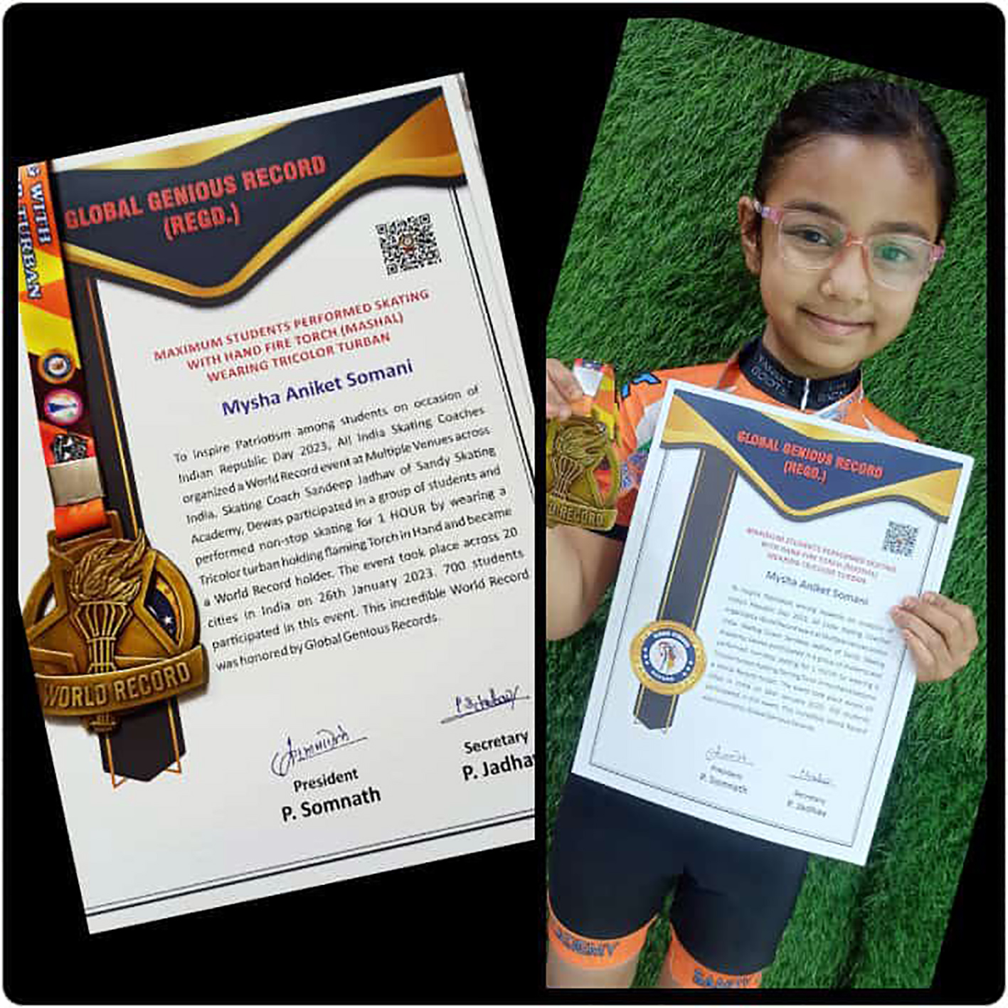 देवास। ऑल इंडिया स्कटिंग कोचेस द्वारा पूरे भारत में करीब 20 शहरों में वर्ल्ड रिकार्ड के लिए कार्यक्रम आयोजित किया गया जिसमें तकरीबन 700 बच्चों ने भाग लिया। जिसमें स्केटर द्वारा लगातार एक घंटेे तक नॉन स्टॉप जलती हुई टार्च (मशाल)लेकर स्केटिंग करना थी। वर्ल्ड रिकार्ड इंडिया एवं जीनियस फाउंडेशन द्वारा देवास की 6 वर्षीय होनहार स्केटर मायशा अनिकेत सोमानी को वर्ल्ड रिकार्ड होल्डर घोषित किया तथा ग्लोबल जीनियस रिकार्ड से भी सम्मानित किया गया। मायशा को प्रमाण पत्र एवं मेडल दिया गया। मायशा की माताजी रूपल सोमानी ने बताया कि मायशा अपनी मेहनत एवं कोच देवराज सांगते के निर्देशन में स्केटिंग में वर्ल्ड रेकार्ड हासिल किया है। मायशा की उपलब्धि पर परिवार एवं समाजजनों ने बधाई देते हुए उज्जवल भविष्य की कामना की।