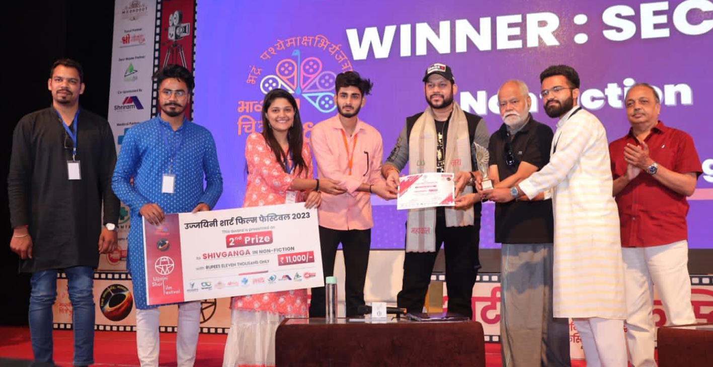 देवास। उज्जैन में 9-10 अप्रैल को आयोजित उज्जैयिनी शार्ट फि़ल्म फ़ेस्टीवल के तीसरे संस्करण में देवास के आयुष शर्मा की शार्ट फिल्म शिवगंगा को नॉन-फि़क्शन कैटेगरी में द्वितीय पुरस्कार प्राप्त हुआ। आयुष शर्मा ने झाबुआ के जनजातीय क्षेत्र में जलसंवर्धन हेतु जनजातीय परंपरा हलमा का चित्रण अपनी डाक्यूमेंट्री फिल्म में किया है। शिवगंगा अभियान पर आधारित यह फिल्म सामाजिक एवं पर्यावरण से जुड़े विषय पर आधारित है , जो स्वावलंबन और परमार्थ का संदेश देता है। सिनेमेटोग्राफी और अन्य तकनीकी पहलुओं की दृष्टि से भी इस फि़ल्म की सराहना ज्यूरी और आयोजन समिति ने की। भारतीय चित्र साधना और विश्व संवाद केन्द्र द्वारा आयोजित इस फि़ल्मोत्सव में देवास के नवोदित फि़ल्मकार आयुष शर्मा द्वारा निर्देशित एक और शार्ट फिल्म की स्क्रीनिंग हुई। इस फि़ल्म में खरगोन दंगों का जीवंत चित्रण है। दंगों के भयावह वातावरण के बीच फिल्म निर्माण, एक फि़ल्मकार के पत्रकार की पहचान भी है। आयुष शर्मा ने मालवा-निमाड और मध्यभारत के सबसे बड़े फि़ल्मोत्सव के माध्यम से पुरे देवास और देवास के कलाप्रेमियों को गौरवान्वित किया है। फ़ेस्टीवल में कुल 245 फिल्मों में से 45 की स्क्रीनिंग हुई थी जिसमें 6 को पुरस्कार मिला है। बाबा महाकालेश्वर की नगरी में चल रहे मध्यभारत के सबसे बड़े दो दिवसीय उज्जैनी शार्ट फि़ल्म फेस्टिवल के समापन समारोह में विख्यात अभिनेता संजय मिश्रा एवं प्रसिद्ध लेखक , डायरेक्टर राज शांडिल्य उपस्थित रहे। उन्होंने फिक्शन एवं नॉन फिक्शन केटेगरी में विजेताओं को पुरस्कार वितरित किये।