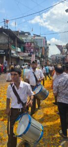 शहर की 32 बस्तियों से हजारों स्वयंसेवक सफेद शर्ट, खाकी पतलून और काली टोपी में एकरूपता और अनुशासन का अद्भुत प्रदर्शन करते हुए पथ संचलन में शामिल हुए। चार किलोमीटर लंबे मार्ग पर 100 से अधिक घोष, ध्वज और वाहिनियां एक साथ संगठित स्वरूप में चलते हुए जब आगे बढ़ीं, तो दृश्य देखते ही बनता था। घोष की ध्वनियां, भगवा ध्वज की लहराहट और स्वयंसेवकों की कदमताल ने वातावरण को ऊर्जावान बना दिया।