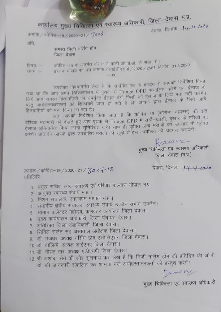 देवास। कोरोना वायरस के बचाव हेतु देश भर में किये लॉक डाउन में सारे काम काज बन्द है। लेकिन जरुरी सुविधा जैसे नर्सिंग होम, मेडिकल, खाद्य सामग्री, दूध वितरण सुचारू रूप से चालू है। लेकिन ऐसे में देवास के निजी नर्सिंग होम ओर डाक्टरों ने अपनी सेवा देना भी बन्द कर दिया। जिससे अन्य बीमारियों के इलाज में लोगो को परेशानियों का सामना करना पड़ रहा था। इस स्थिति में कई लोगो द्वारा शिकायत भी की गई थी।