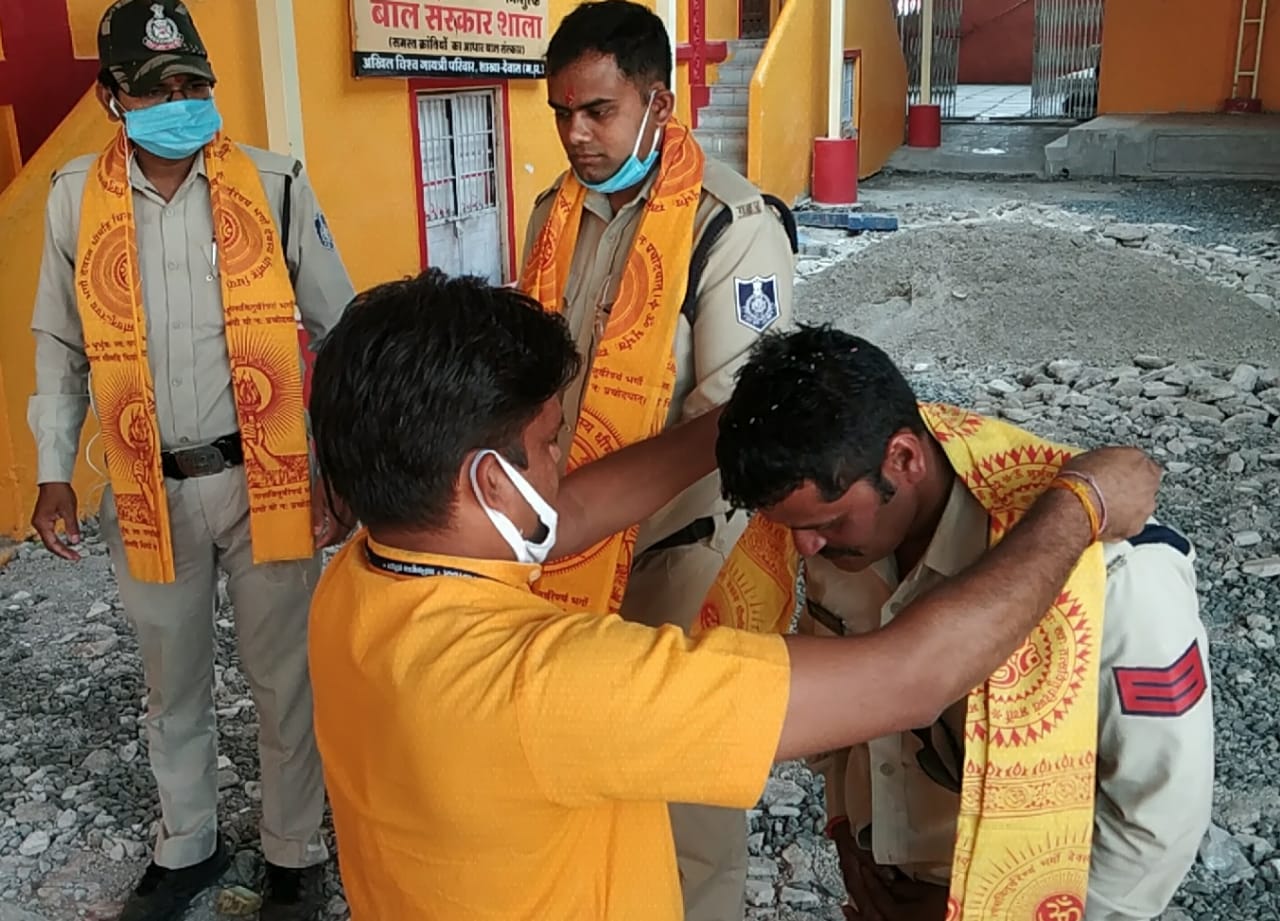 गायत्री शक्तिपीठ जनसंचार विभाग के विक्रमसिंह चौधरी ने बताया कि गायत्री शक्तिपीठ के परिव्राजक चन्द्रिका शर्मा ने सभी को मंगल तिलक लगाकर स्वागत किया ततपश्चात गायत्री मंत्र के उपवस्त्र ओढाकर हार्दिक अभिनंदन कर परम पूज्य गुरुदेव पं. श्रीराम शर्मा आचार्यजी द्वारा लिखित साहित्य भेंट किया गया। युवा प्रकोष्ठ जिला संयोजक प्रमोद निहाले एवं लक्ष्मण पटेल ने कहा कि आज के हालात में कोरोना महामारी से बचाव में सबसे अधिक मेहनत और परेशानियों का सामना करना पड़ता है। हर प्रकार की कठिनाइयों से देश को बचाने का पूरा श्रेय पुलिस प्रशासन, सफाई कर्मी, डॉक्टर, नर्स एवं राजस्व विभाग को जाता है। हमें इनका आभार मानते हुए हर परिस्थिति में इनका उत्साहपूर्वक मनोबल बढ़ाना चाहिए। गायत्री परिवार के रामनिवास कुशवाह ने आमजन से अपील की है कि आज की स्थिति में पीडि़त मानवता की सेवा हर हाल में करे भोजन पैकेट सेवा गायत्री परिवार द्वारा निरन्तर चल रही है, आप भी अनुदान देकर पुण्य के भागीदार बनें। गायत्री परिवार द्वारा प्रतिदिन लगभग 150 से 200 भोजन पैकेट तैयार कर प्रशासन के सहयोग से वितरित किए जाते हैं। इस अवसर पर गायत्री परिवार के केशव पटेल, मनोहर निहाले, शुभम, हीरालाल निहाले, सीमा कुशवाह आदि उपस्थित थे।