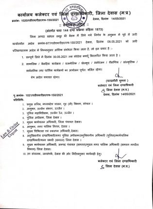 देवास, 15 मई 2021/ कलेक्टर एवं जिला दंडाधिकारी चंद्रमौली शुक्ला ने पूर्व जारी कोरोना कर्फ्यू में आंशिक संशोधन करते हुए सम्पूर्ण देवास जिले में दिनांक 30 मई 2021 तक पूर्णत: कोरोना कर्फ्यू लागू करने के आदेश जारी किए हैं। जारी आदेशानुसार दिनांक 06.05.2021 को आयोजित जिला आपदा प्रबंधन समूह की बैठक में लिये गये निर्णय […]