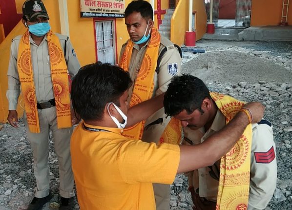 कोरोना लड़ाई के जांबाज पुलिस कर्मी एवं सफाई कर्मी भाइयों का आत्मीय स्वागतकर साहित्य भेंट किया