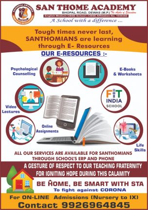 देवास/भोपाल रोङ स्थित सेन थॉम एकेडमी में LOCKDOWN के इस मुश्किल दौर में ई.लर्निंग के द्वारा विद्यार्थियों को शिक्षा प्रदान की जा रही है। वर्तमान दौर में विश्वव्यापी कोरोना संक्रमण जैसी आपदा को ध्यानांतर्गत रखते हुए विद्यार्थियों को यह सुविधा दी जा रही है जिससे वे इस मुश्किल समय में भी शिक्षा से वंचित न […]
