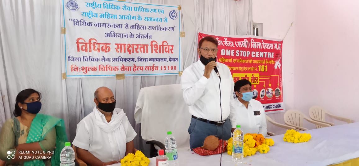 देवास, 11 अक्‍टूबर 2020/ राष्ट्रीय विधिक सेवा प्राधिकरण नई दिल्ली एवं म.प्र. राज्य विधिक सेवा प्राधिकरण के निर्देशानुसार जिला न्यायाधीश एवं अध्यक्ष जिला विधिक सेवा प्राधिकरण देवास योगेश कुमार गुप्ता के मार्गदर्शन एवं शमरोज खान सचिव जिला विधिक सेवा प्राधिकरण देवास के निर्देशन में महिलाओं से संबंधित कानून और मुद्दों के संबंध में जागरूकता एवं महिलाओं को सशक्त किये जाने हेतु राष्ट्रीय महिला आयोग के समन्वय से ग्राम जामगोद में ग्रामीण महिलाओं के लिए विशेष विधिक जागरूकता शिविर आयोजित किया गया।