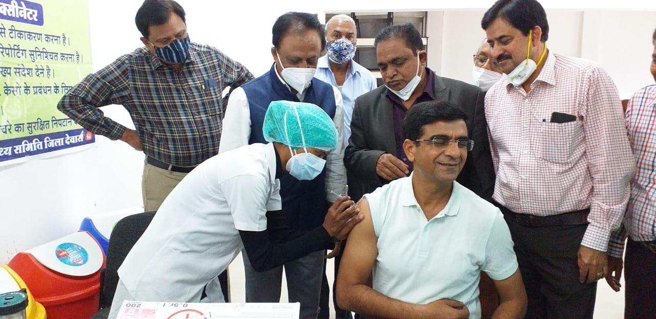 देवास 17 फरवरी 2021/ दूसरे चरण में आज कलेक्टर चन्द्रमौली शुक्ला ने वैक्सीनेशन करवाया। साथ ही कलेक्टर कार्यालय स्टॉफ से अमित श्रीवास्तव एवं आशीष कोपरगांवकर सहित अन्य फ्रंट लाइन योद्धाओं को वैक्सीनेशन करवाया। वैक्सीनेशन के बाद कलेक्टर श्री शुक्ला सहित अन्य फ्रंट लाइन योद्धा 30 मिनट आब्जर्वेशन रूम में रूके। जिले में कोरोना वायरस वैक्सीनेशन का दूसरा चरण 8 फरवरी से प्रारंभ हो गया है।