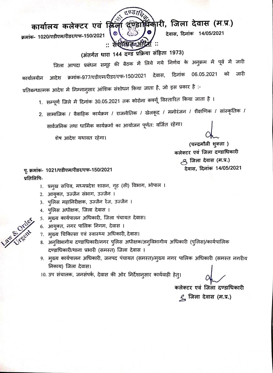 देवास, 15 मई 2021/ कलेक्टर एवं जिला दंडाधिकारी चंद्रमौली शुक्ला ने पूर्व जारी कोरोना कर्फ्यू में आंशिक संशोधन करते हुए सम्पूर्ण देवास जिले में दिनांक 30 मई 2021 तक पूर्णत: कोरोना कर्फ्यू लागू करने के आदेश जारी किए हैं। जारी आदेशानुसार दिनांक 06.05.2021 को आयोजित जिला आपदा प्रबंधन समूह की बैठक में लिये गये निर्णय के अनुक्रम में पूर्व में जारी प्रतिबन्धात्मक आदेश में आंशिक संशोधन किया है। जारी आदेशानुसार सम्पूर्ण जिले में दिनांक 30.05.2021 तक कोरोना कर्फ्यू विस्तारित किया गया है।