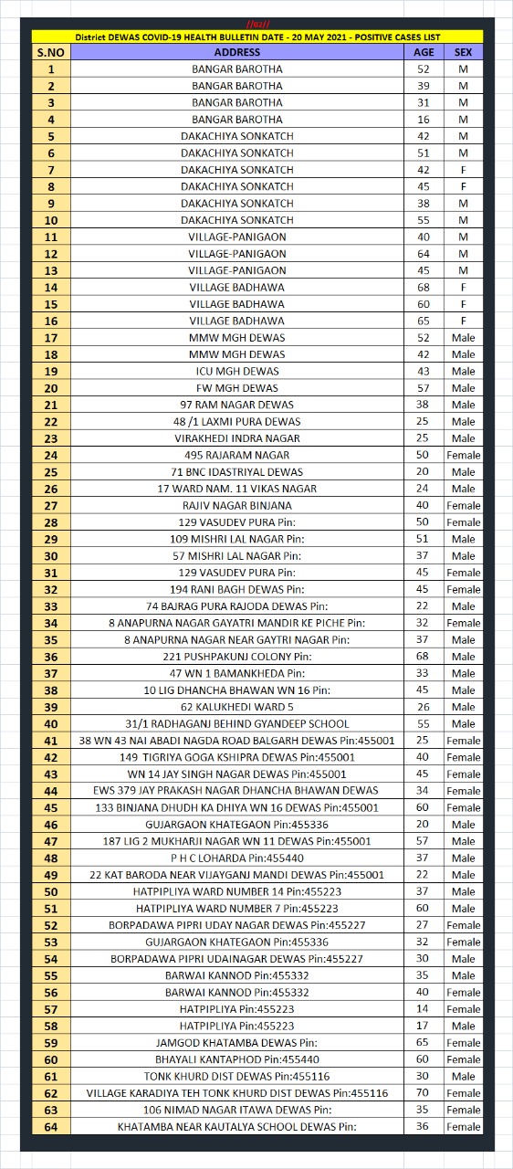 देवास में आज 64 नए कोरोना मरीज, स्वस्थ हुए 89