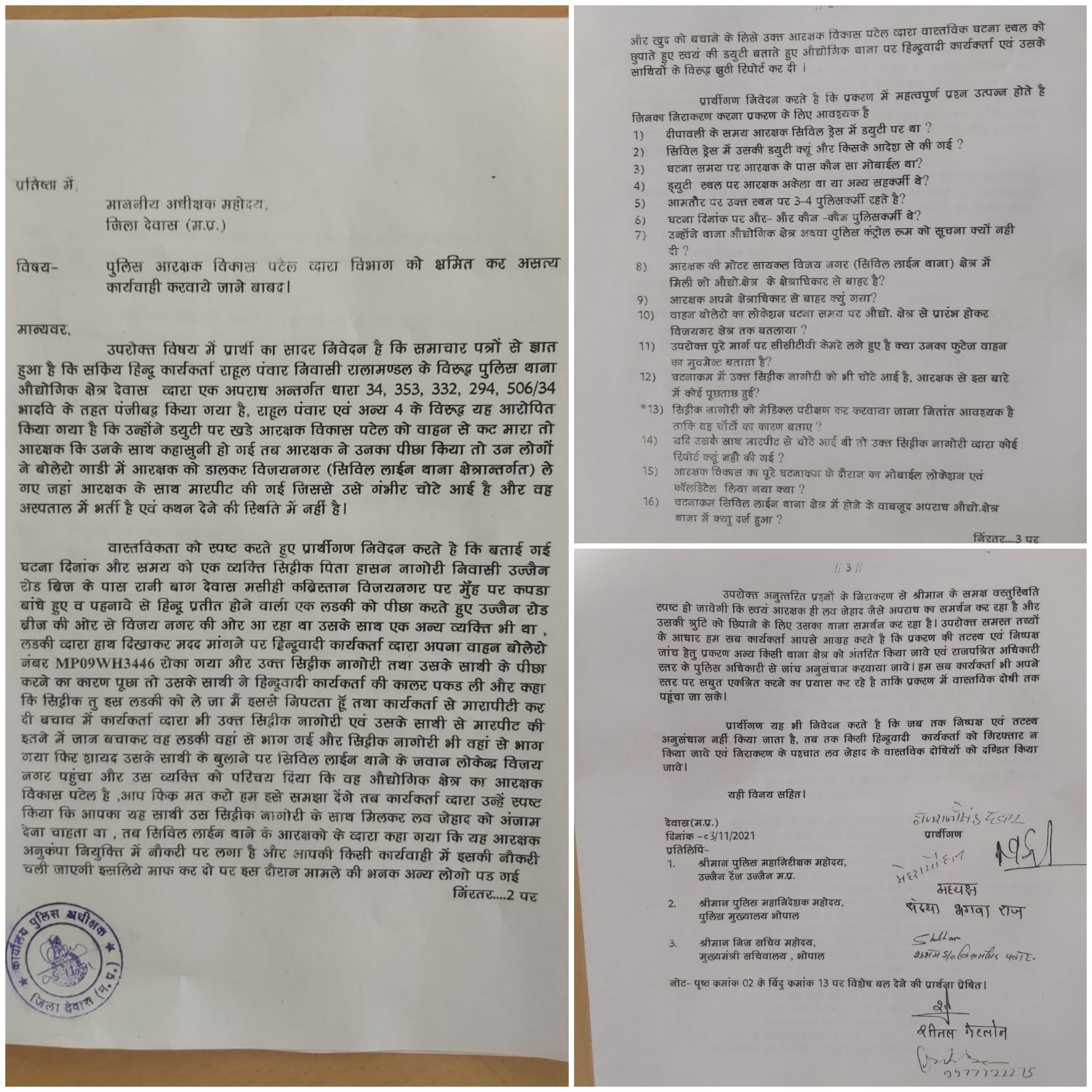 देवास टाइम्स/ देवास के हिन्दू संगठन के द्वारा आज पुलिस आरक्षक विकास पटेल के खिलाफ ज्ञापन दिया है। जिसमे उनके द्वारा आरोप लगाया है की विकास पटेल पुलिस विभाग को भ्रमित कर रहा है और विकास पटेल ने इसमें असत्य कार्यवाही करवाई है। हिंदू संगठन द्वारा बताया गया है कि सिद्दीक पिता हसन नागोरी निवासी उज्जैन रोड ब्रिज है जो कपड़ा बांधकर हुए एक लड़की जो विजय नगर की और जा रही थी, उसका का पीछा कर रहा था। उसके साथ अन्य व्यक्ति भी था। लड़की द्वारा हाथ दिखा कर मदद मांगने पर हिंदूवादी कार्यकर्ता रुके, सिद्दीकी नागौरी तथा उसके साथी के पीछा करने का कारण पूछा। अन्य साथी द्वारा कार्यकर्तोओं की कालर पकड़ली। बिच बचाव में मारापीटी शुरू हो गई।