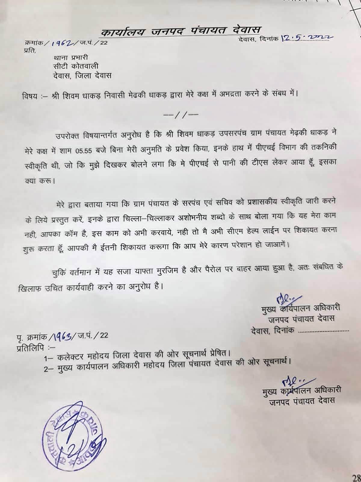 देवास। जनपद पंचायत देवास के सीईओ कार्यालय में बिना अनुमति घुसकर अभद्रता करने पर मुख्य कार्यपालन अधिकारी ने सिटी कोतवाली थाना प्रभारी के नाम आवेदन सौंपा है। आवेदन में सीईओ मारीषा शिंदे ने बताया कि ग्राम पंचायत मेंढकी धाकड़ के उपसरपंच शिवम धाकड़ ने गुरूवार को मेरे कक्ष में शाम 05.55 बजे मेरी बिना अनुमति के प्रवेश किया। इनके हाथ में पीएचई विभाग के तकनीकी स्वीकृति थी जो मुझे दिखाकर बोलने लगा कि में पीएचई से पानी की टीएस लेकर आया हूँ, इसका क्या करू। जिस पर मैंने उन्हें बताया कि ग्राम पंचायत के सरपंच एवं सचिव को प्रशासकीय स्वीकृति जारी करने के लिए प्रस्तुत करे। इसके बाद शिवम धाकड़ ने चिल्ला-चिल्लाकर अशोभनीय शब्दों के साथ बोला कि यह मेरा काम नही है आपका काम है। इस काम को अभी करवाएं, नही तो मैं अभी सीएम हैल्पलाईन पर शिकायत करवाता हूँ, आपकी इतनी शिकायत करूंगा की आप मेरे कारण परेशान हो जाओगे। जनपद सीईओ ने बताया कि यह वर्तमान में सजा याफ्ता मुजरिम है और पेरोल पर बाहर आया है। सीईओ श्रीमती शिंदे ने संबंधित के खिलाफ उचित कार्यवाही की मांग की है।