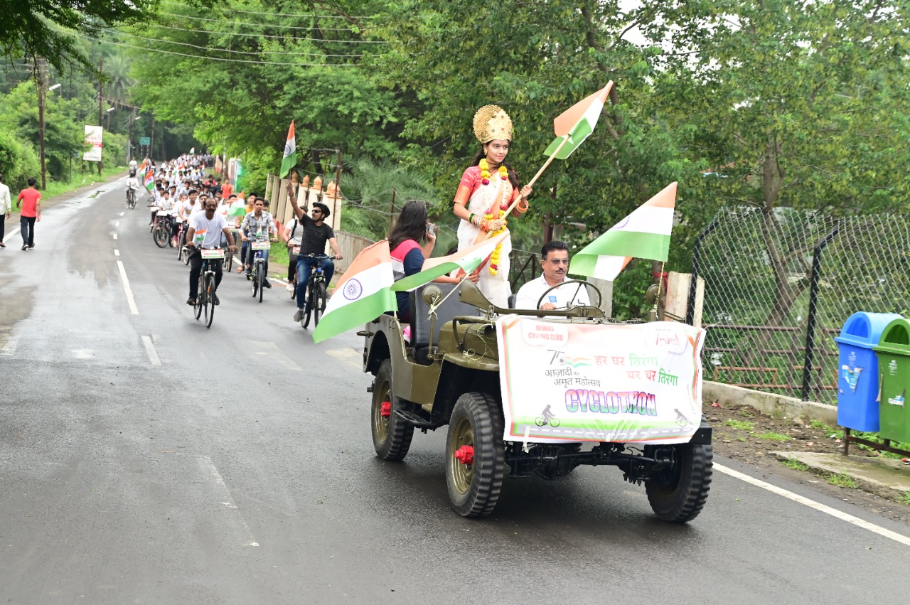 देवास। आजादी का अमृत महोत्सव अंतर्गत हर घर तिरंगा अभियान में आज देवास साईक्लिंग क्लब और यजत इवेंट्स ने सायक्लोथॉन आयोजित की ।सायकोलोथोन सयाजी द्वार से शुरू होकर शहर के विभिन्न मार्गो से होते हुए तुकोजीराव पवार स्टेडियम पर संपन्न हुई। *सायक्लोथॉन की शुरुवात रोटरी क्लब अध्यक्ष सुधीर पंडित और रोट्रैक्ट क्लब अध्यक्ष रचिता राणा* द्वारा की गई, सायक्लोथॉन में हर उम्र के विद्यार्थीयो ने बड़े उत्साह से हिस्सा लिया। जिसमे सबसे कम उम्र के नो वर्षीय विद्यार्थी ईशू शर्मा ने बढ़ चढ़ कर हिस्सा लिया। जो सायक्लोथॉन में प्रथम स्थान पर साईक्लिंग कर रहा था।