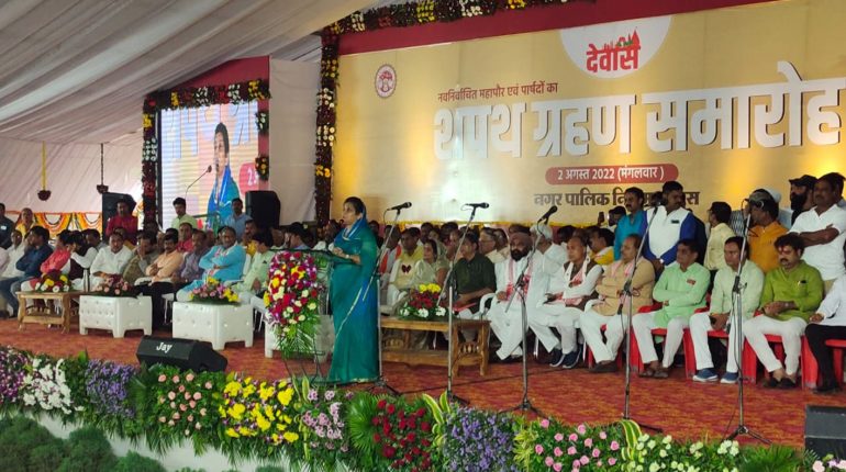 – विधायक ने कहा नव नवनिर्वाचित महापौर एवं पार्षद शहर हित के विकास कार्यो को ओर आगे बढ़ायेगे देवास। स्थानिय आई.टीआई ग्राउंड पर नव नवनिर्वाचित महापौर श्रीमती गीता अग्रवाल एवं 45 नव नवनिर्वाचित पार्षदों का शपथ ग्रहण मंत्रोच्चार के साथ हुआ। कलेक्टर चन्द्रमौली शुक्ला के द्वारा पहले नवनिर्वाचित महापौर श्रीमती गीता अग्रवाल को शपथ दिलाई […]